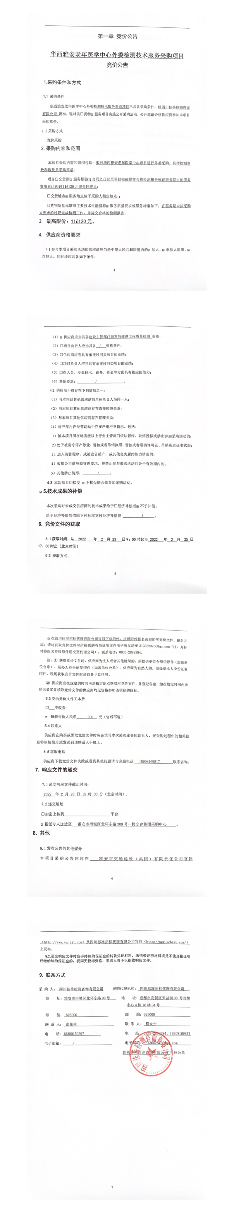 四川佳岳檢測咨詢有限公司華西雅安老年醫(yī)學(xué)中心外委檢測技術(shù)服務(wù)采購項目競價公告