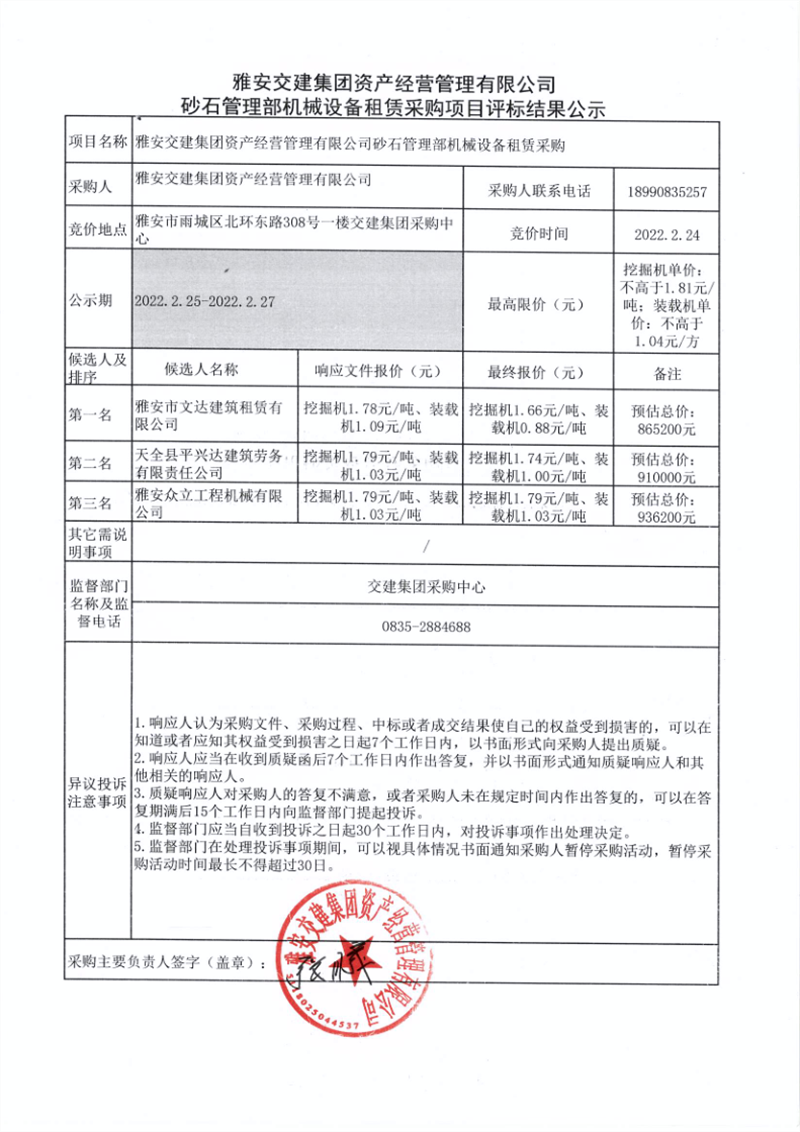 雅安交建集團資產(chǎn)經(jīng)營管理有限公司砂石管理部機械設備租賃采購項目評標結果公示