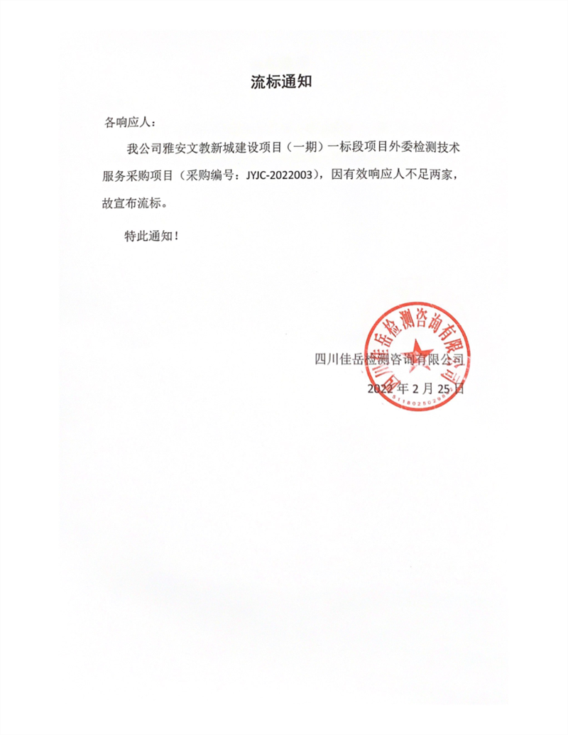 四川佳岳檢測咨詢有限公司雅安文教新城國際社區(qū)蜀天星辰項目(一期)外委檢測服務(wù)采購項目流標通知