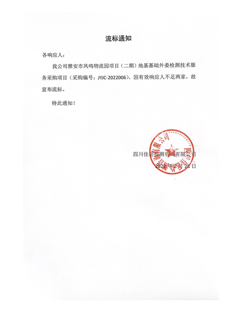 四川佳岳檢測(cè)咨詢有限公司雅安市鳳鳴物流園項(xiàng)目(二期)地基基礎(chǔ)外委檢測(cè)技術(shù)服務(wù)采購項(xiàng)目流標(biāo)通知