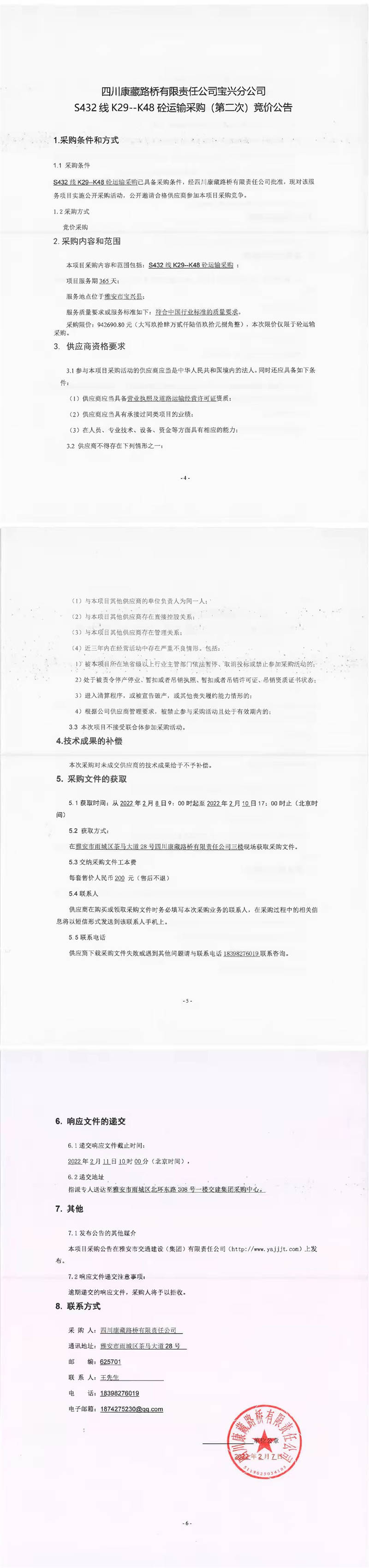 四川康藏路橋有限責任公司寶興分公司S432線K29-K48砼運輸采購(第二次)競價公告