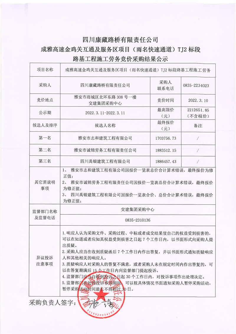 四川康藏路橋有限責(zé)任公司成雅高速金雞關(guān)互通及服務(wù)區(qū)項(xiàng)目(雨名快速通道)TJ2標(biāo)段路基工程施工勞務(wù)競(jìng)價(jià)采購結(jié)果公示