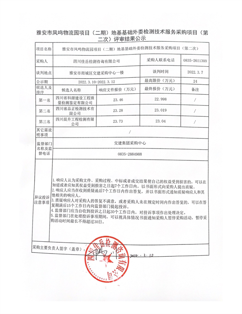 四川佳岳檢測(cè)咨詢(xún)有限公司雅安市鳳鳴物流園項(xiàng)目(二期)地基基礎(chǔ)外委檢測(cè)技術(shù)服務(wù)采購(gòu)項(xiàng)目(第二次)評(píng)審結(jié)果公示