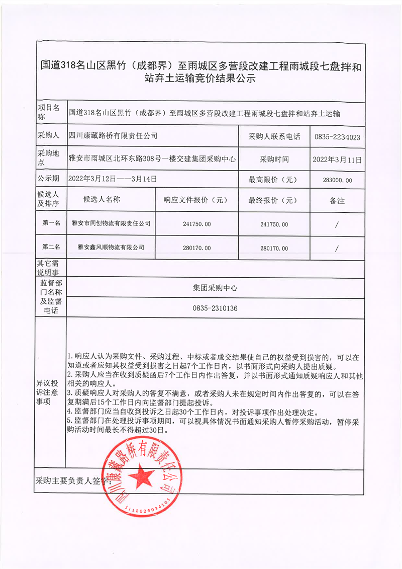 四川康藏路橋有限責(zé)任公司國道318名山區(qū)黑竹(成都界)至雨城區(qū)多營段改建工程雨城段七盤拌和站棄土運(yùn)輸競價(jià)結(jié)果公示