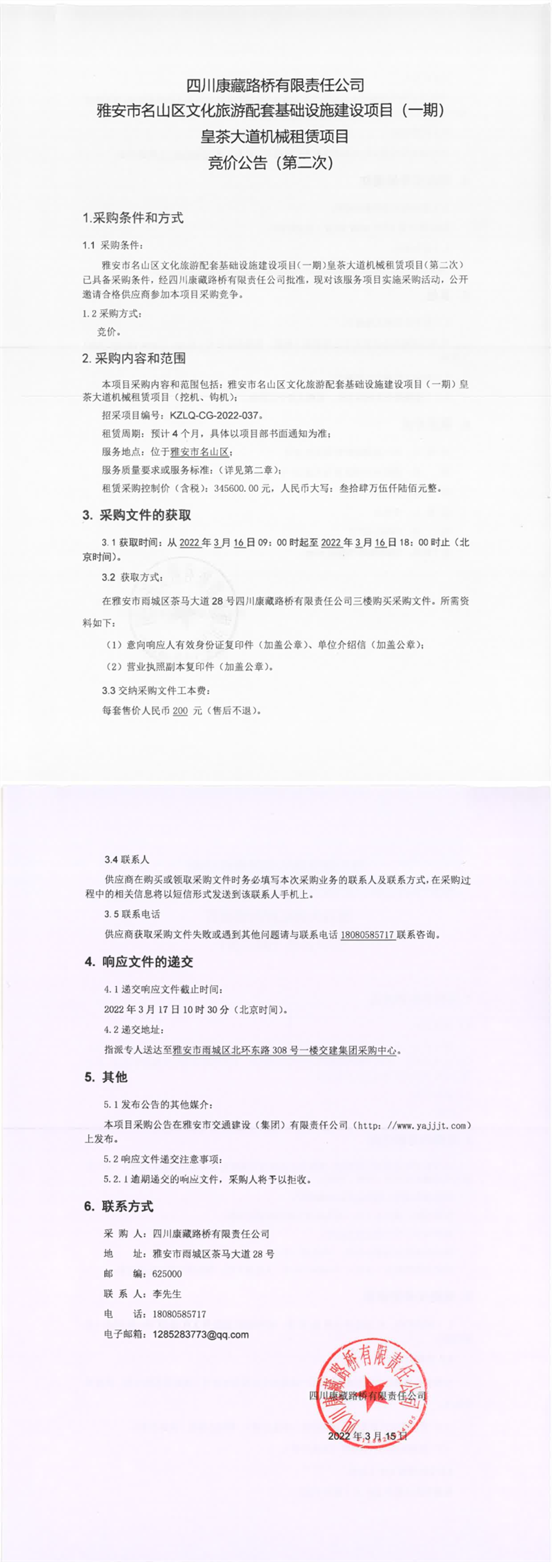 四川康藏路橋有限責任公司雅安市名山區(qū)文化旅游配套基礎(chǔ)設(shè)施建設(shè)項目(一期)皇茶大道機械租賃項目競價公告(第二次)