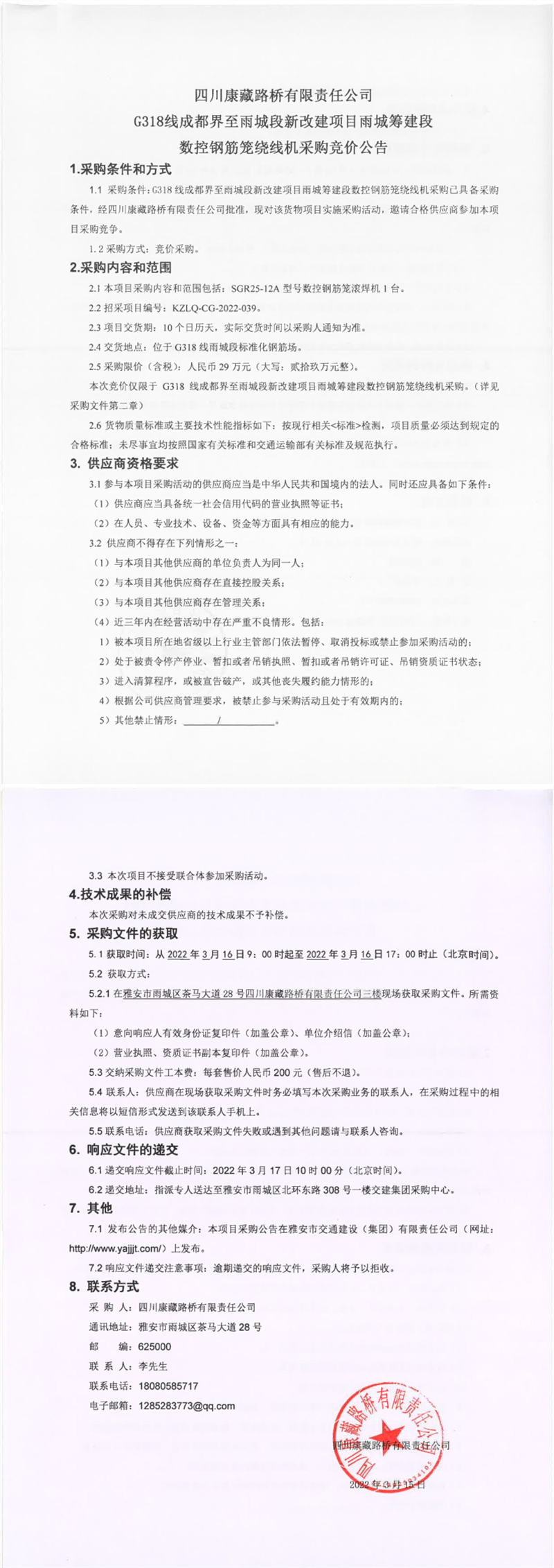 四川康藏路橋有限責(zé)任公司G318線成都界至雨城段新改建項目雨城籌建段數(shù)控鋼筋籠繞線機采購競價公告