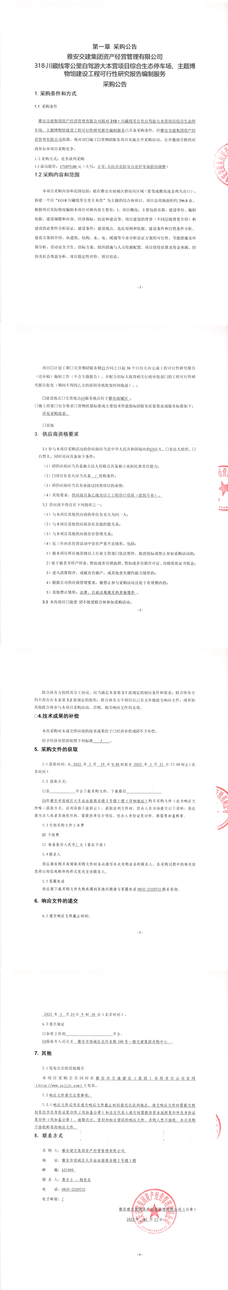 雅安交建集團(tuán)資產(chǎn)經(jīng)營(yíng)管理有限公司318.川藏線零公里自駕游大本營(yíng)項(xiàng)目綜合生態(tài)停車場(chǎng)、主題博物館建設(shè)工程可行性研究報(bào)告編制服務(wù)采購(gòu)公告
