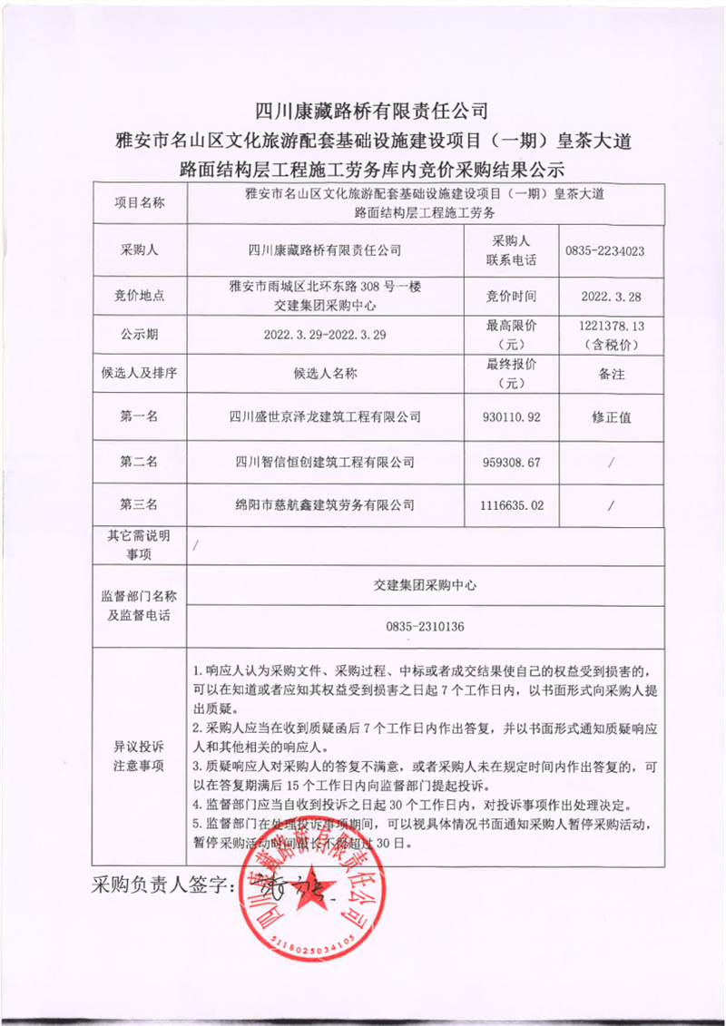 四川康藏路橋有限責任公司雅安市名山區(qū)文化旅游配套基礎(chǔ)設施建設項目(一期)路面結(jié)構(gòu)層工程施工勞務庫內(nèi)競價采購結(jié)果公示