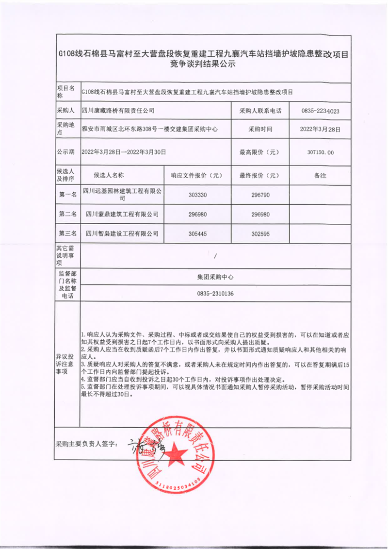四川康藏路橋有限責(zé)任公司G108線石棉縣馬福村至大營盤段恢復(fù)重建九襄汽車站擋墻護(hù)坡隱患整改項(xiàng)目競(jìng)爭(zhēng)談判結(jié)果公示