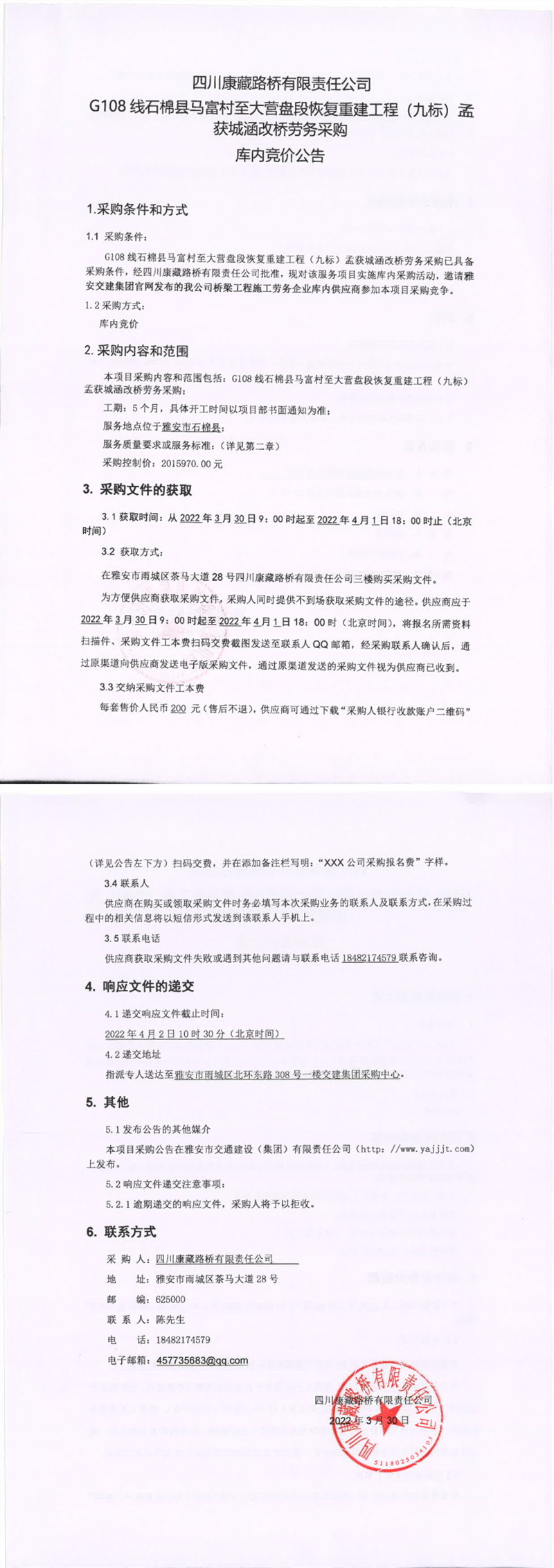 四川康藏路橋有限責(zé)任公司G108線石棉縣馬富村至大營盤段恢復(fù)重建工程(九標(biāo))孟獲城涵改橋勞務(wù)采購庫內(nèi)競價公告