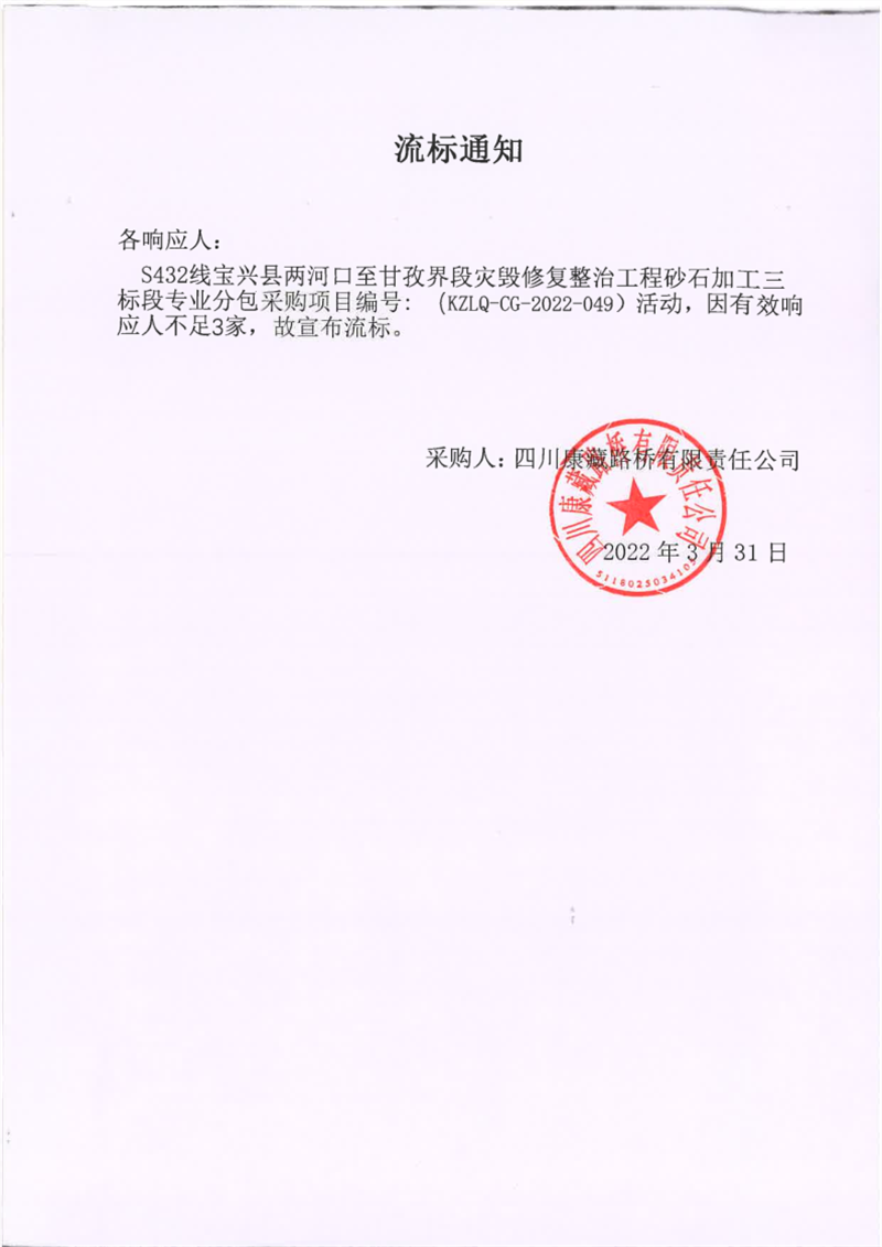 四川康藏路橋有限責(zé)任公司S432線寶興縣兩河口至甘孜界段災(zāi)毀修復(fù)整治工程砂石加工三標(biāo)段專業(yè)分包采購(gòu)項(xiàng)目流標(biāo)通知