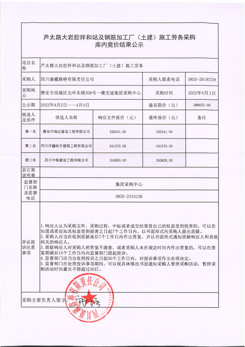 四川康藏路橋有限責(zé)任公司蘆太路大巖腔拌和站及鋼筋加工廠(土建)施工勞務(wù)采購庫內(nèi)競價(jià)結(jié)果公示