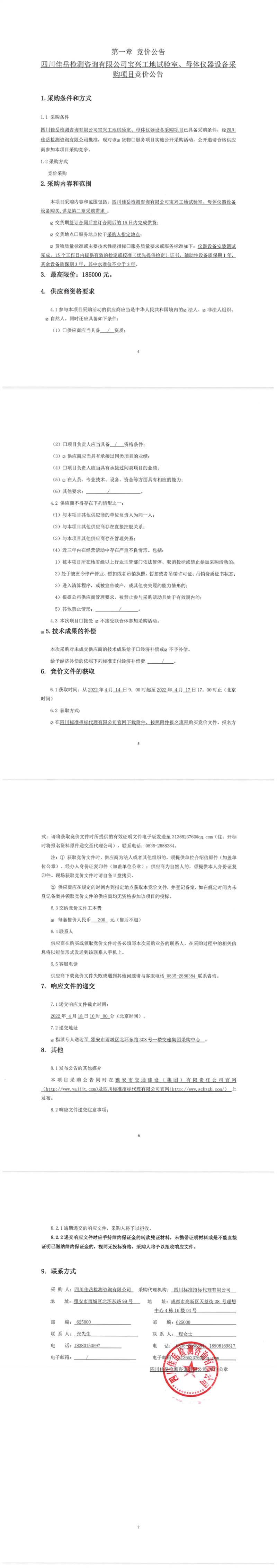 四川佳岳檢測咨詢有限公司寶興工地試驗室、母體儀器設備采購項目競價公告