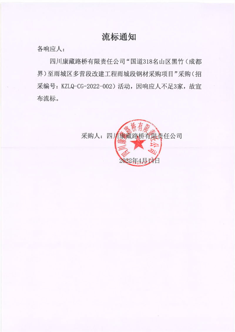 四川康藏路橋有限責(zé)任公司國道318名山區(qū)黑竹(成都界)至雨城區(qū)多營段改建工程雨城段鋼材采購項目流標(biāo)通知