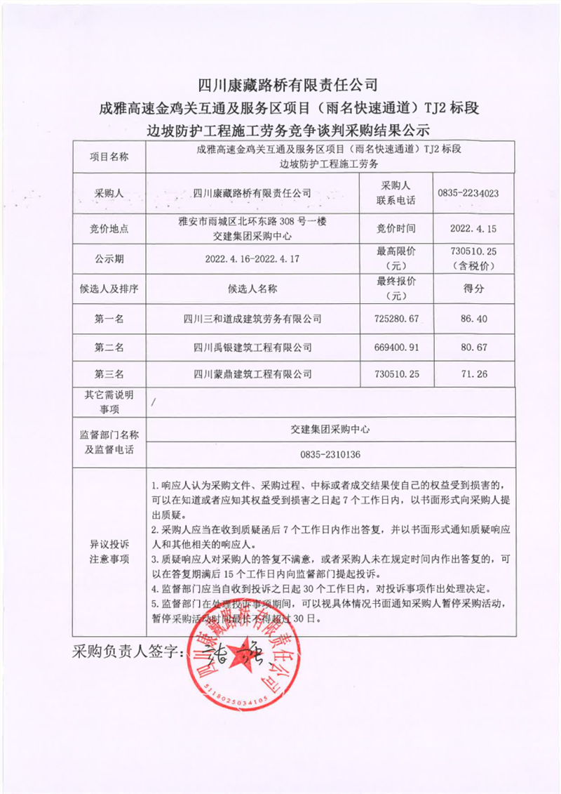 四川康藏路橋有限責(zé)任公司成雅高速金雞關(guān)互通及服務(wù)區(qū)項目(雨名快速通道)TJ2標(biāo)段邊坡防護(hù)工程施工勞務(wù)競爭談判采購結(jié)果公示