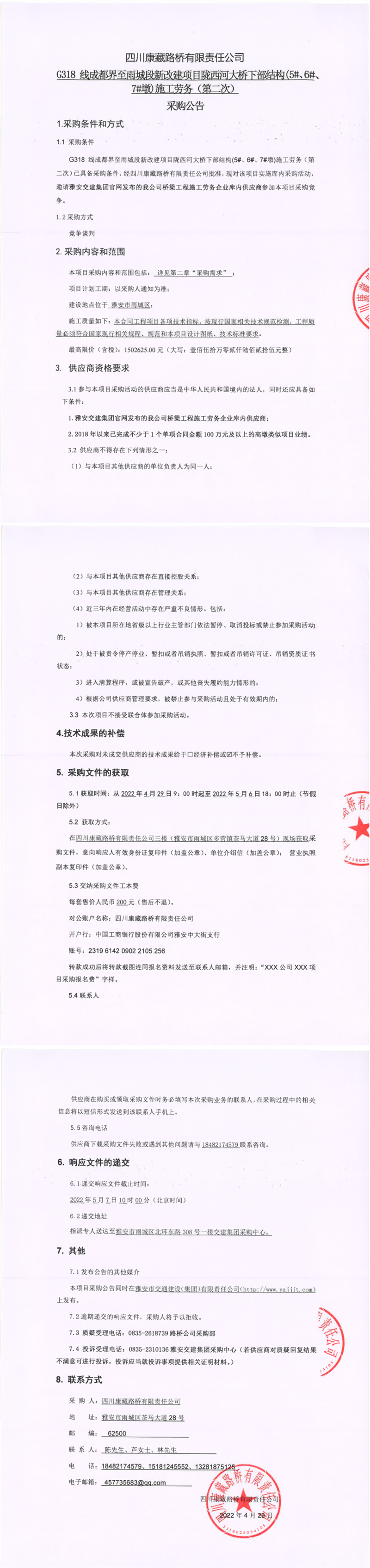 四川康藏路橋有限責任公司G318線成都界至雨城段新改建項目隴西河大橋下部結(jié)構(gòu)(5#、6#、7#墩)施工勞務(wù)(第二次)采購公告