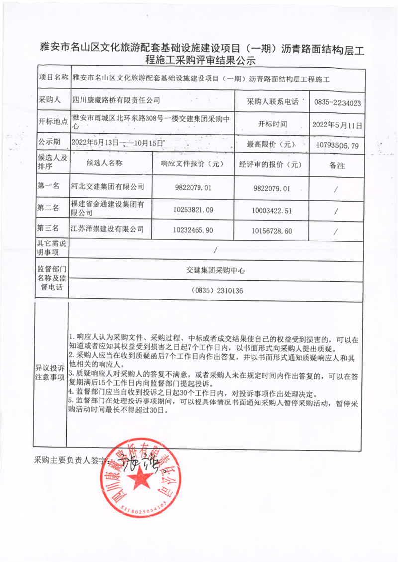 四川康藏路橋有限責任公司雅安市名山區(qū)文化旅游配套基礎(chǔ)設施建設項目(一期)瀝青路面結(jié)構(gòu)層工程施工采購評審結(jié)果公示