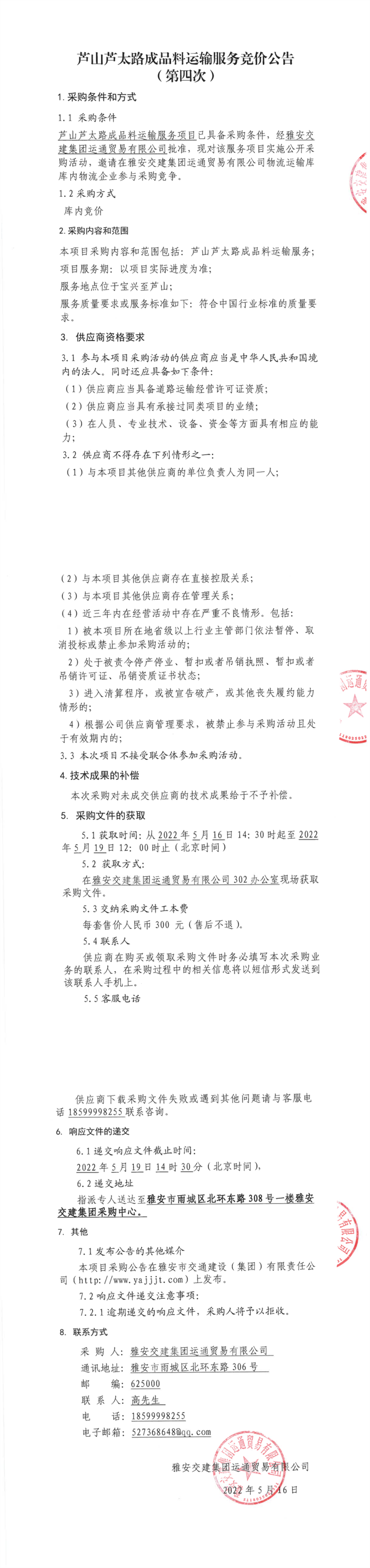 雅安交建集團(tuán)運通貿(mào)易有限公司蘆山蘆太路成品料運輸服務(wù)競價公告(第四次)