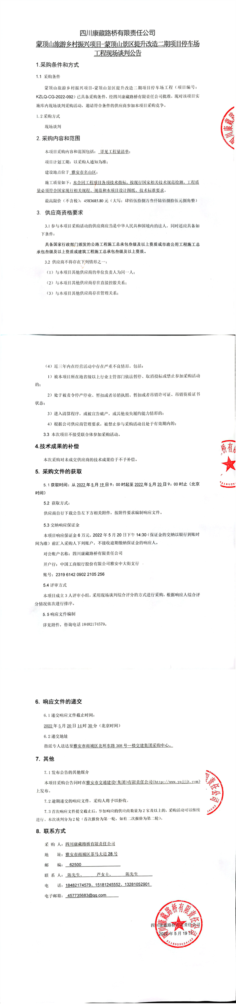 四川康藏路橋有限責(zé)任公司蒙頂山旅游鄉(xiāng)村振興項(xiàng)目-蒙頂山景區(qū)提升改造二期項(xiàng)目停車場工程現(xiàn)場談判公告