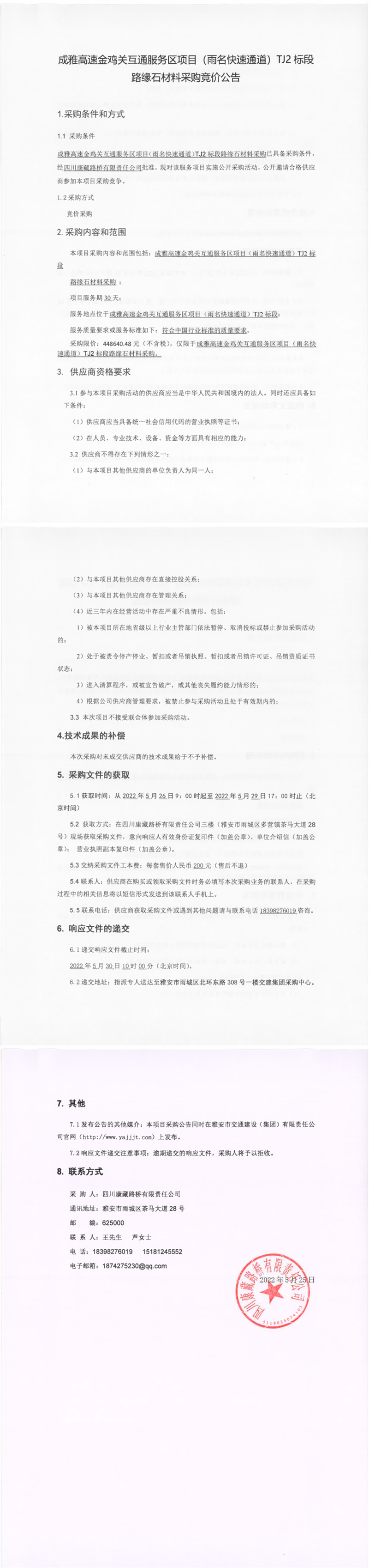 四川康藏路橋有限責(zé)任公司成雅高速金雞關(guān)互通服務(wù)區(qū)項(xiàng)目(雨名快速通道)TJ2標(biāo)段路緣石材料采購競(jìng)價(jià)公告