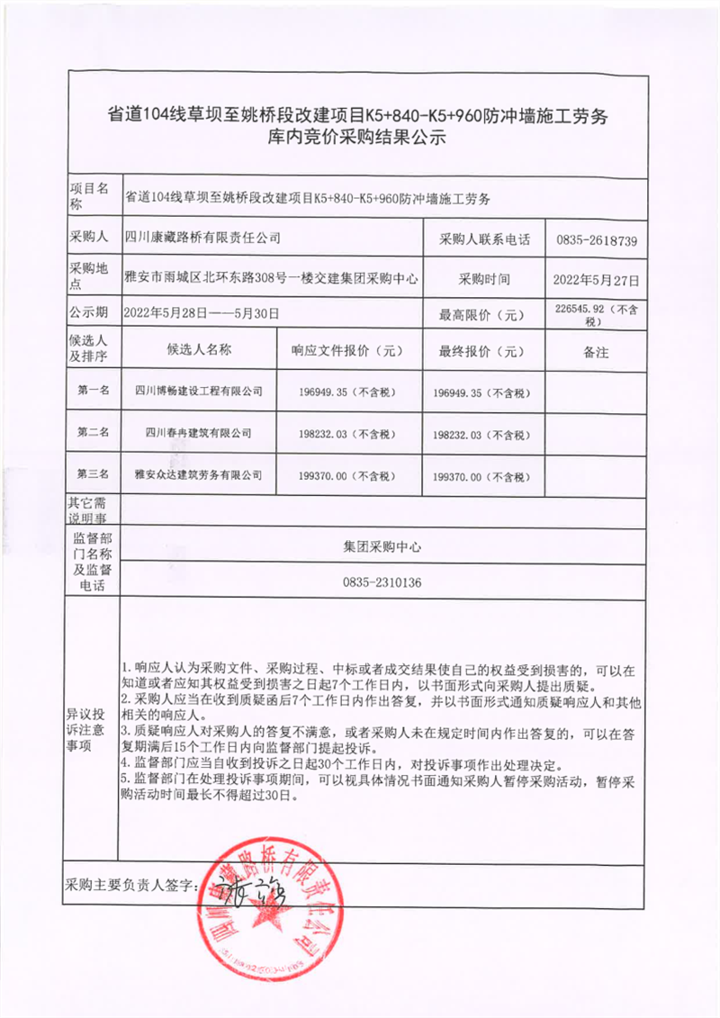 四川康藏路橋有限責任公司省道104線草壩至姚橋段改建項目K5+840-K5+960防沖墻施工勞務庫內(nèi)競價采購結(jié)果公示