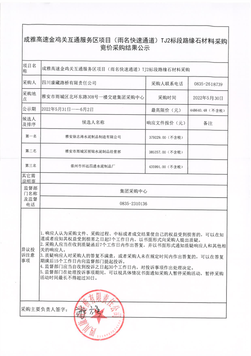 四川康藏路橋有限責(zé)任公司成雅高速金雞關(guān)互通服務(wù)區(qū)項(xiàng)目(雨名快速通道)TJ2標(biāo)段路緣石材料采購競價采購結(jié)果公示