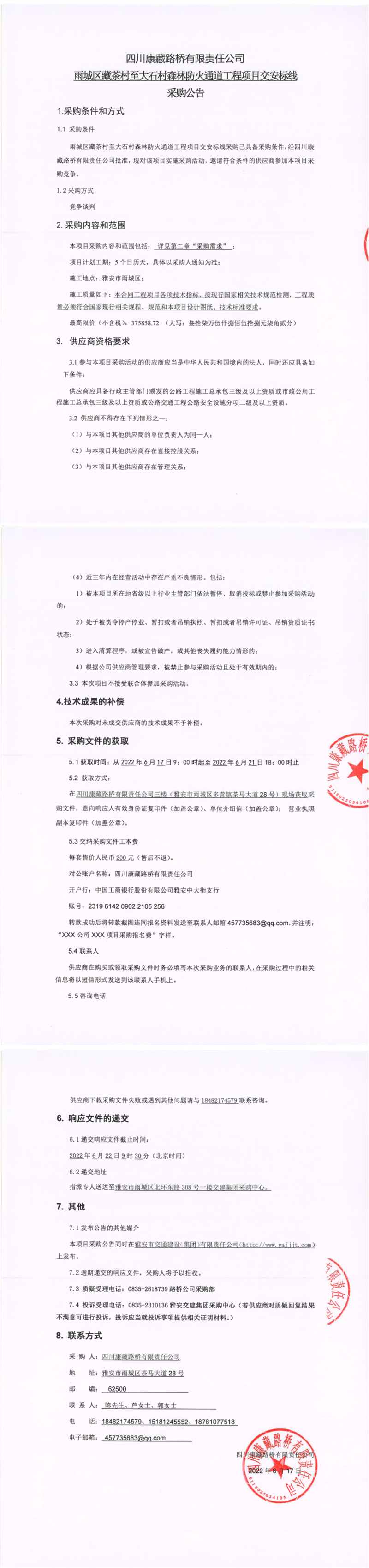 四川康藏路橋有限責(zé)任公司雨城區(qū)藏茶村至大石村森林防火通道工程項目交安標(biāo)線采購公告