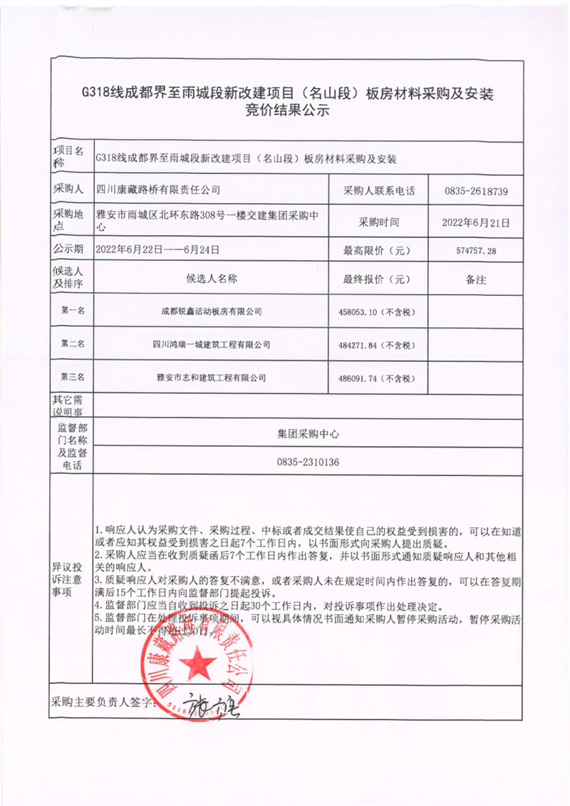四川康藏路橋有限責(zé)任公司G318線成都界至雨城段新改建項(xiàng)目(名山段)板房材料采購及安裝競價(jià)結(jié)果公示