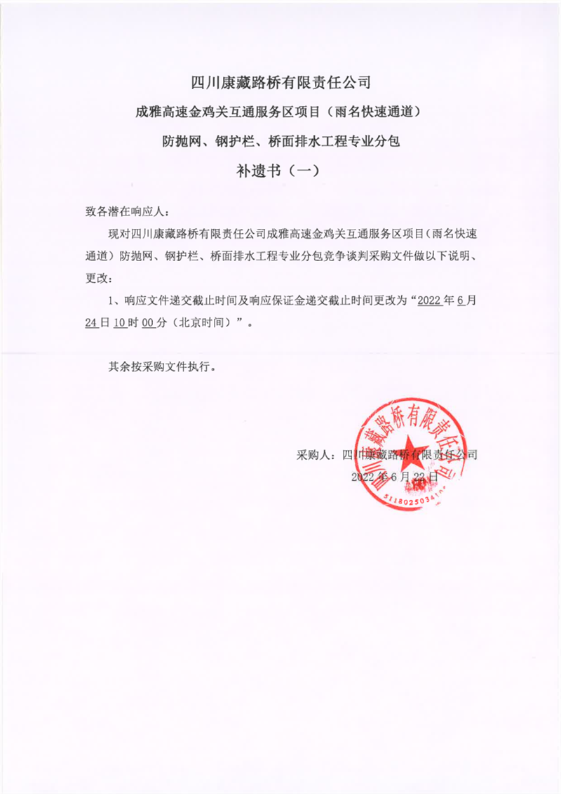 四川康藏路橋有限責(zé)任公司成雅高速金雞關(guān)互通服務(wù)區(qū)項(xiàng)目(雨名快速通道)防拋網(wǎng)、鋼護(hù)欄、橋面排水工程專業(yè)分包補(bǔ)遺書(shū)(一)