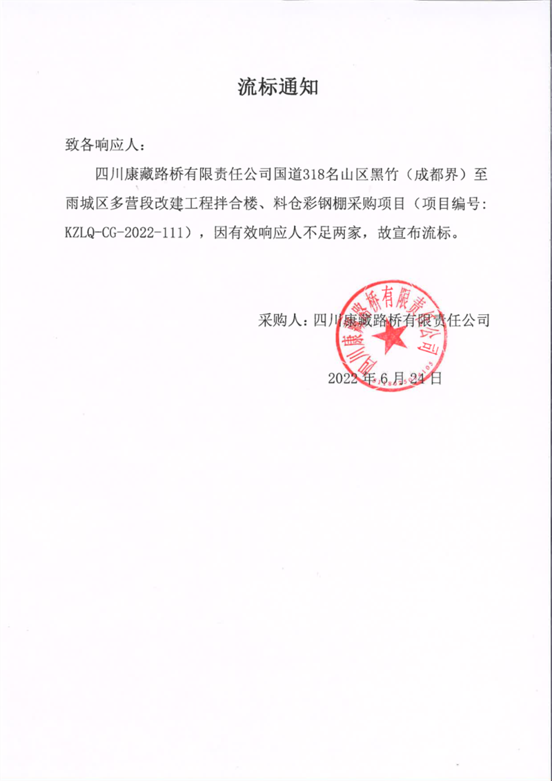 四川康藏路橋有限責(zé)任公司國道318名山區(qū)黑竹(成都界)至雨城區(qū)多營段改建工程拌合樓、料倉彩鋼棚采購項目流標通知