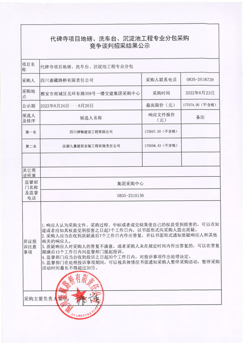 四川康藏路橋有限責(zé)任公司代碑寺項(xiàng)目地磅、洗車臺(tái)、沉淀池工程專業(yè)分包采購競(jìng)爭(zhēng)談判招采結(jié)果公示