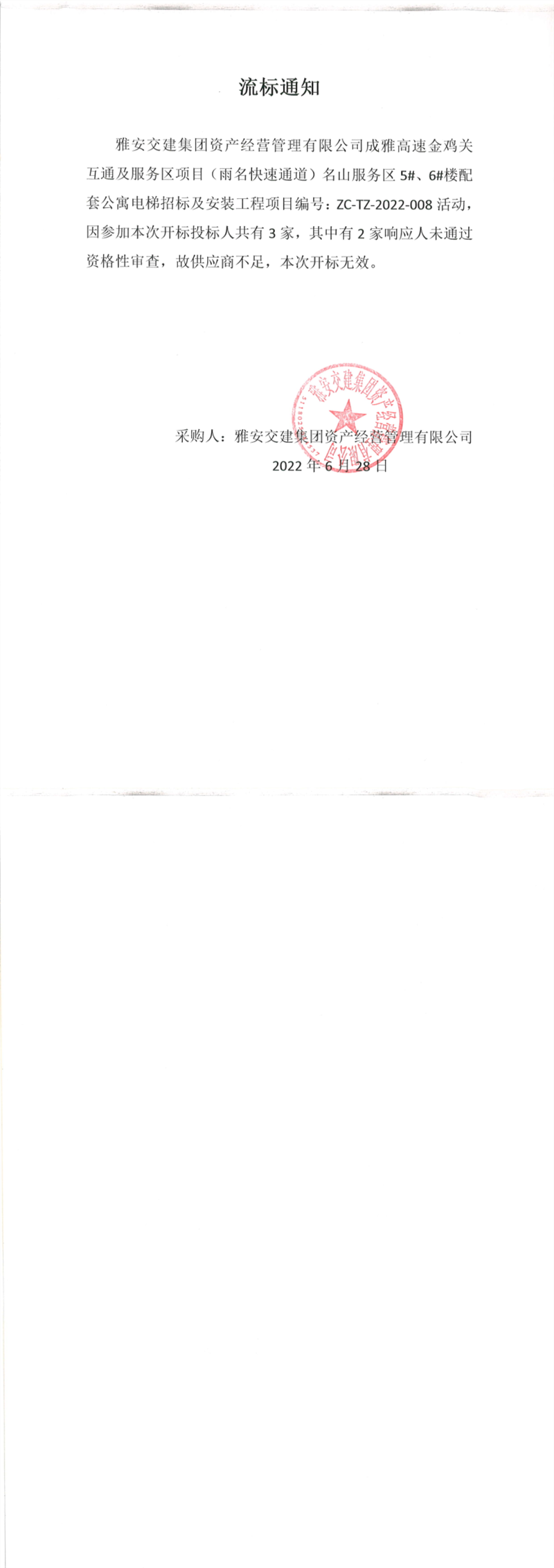 雅安交建集團資產(chǎn)經(jīng)營管理有限公司成雅高速金雞關(guān)互通及服務(wù)區(qū)(雨名快速通道)名山服務(wù)區(qū)5#、6#樓配套公寓電梯招標及安裝工程項目流標通知
