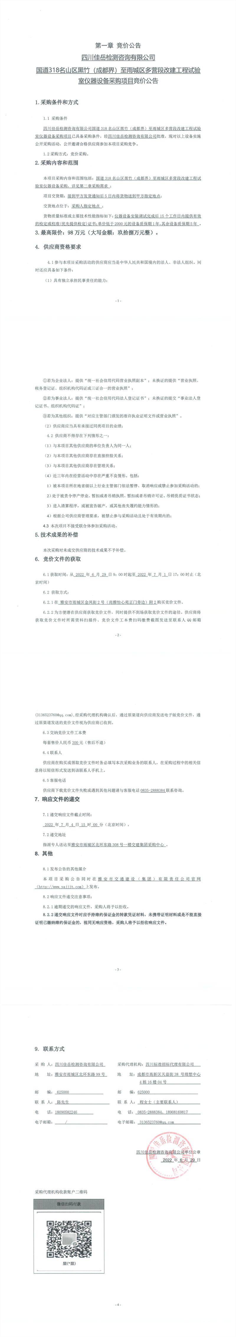 四川佳岳檢測咨詢有限公司國道318名山區(qū)黑竹(成都界)至雨城區(qū)多營段改建工程試驗室儀器設(shè)備采購項目競價公告