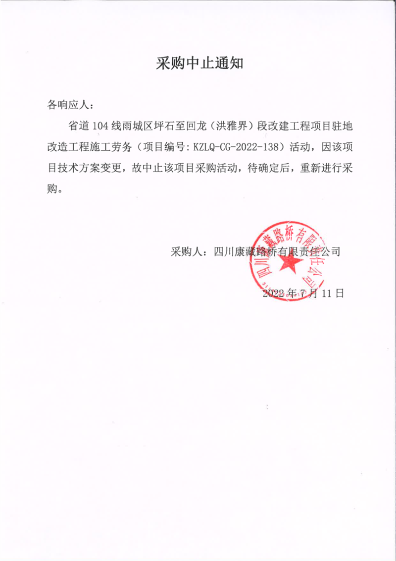 四川康藏路橋有限責(zé)任公司省道104線雨城區(qū)坪石至回龍(洪雅界)段改建工程項(xiàng)目駐地改造工程施工勞務(wù)采購(gòu)中止通知