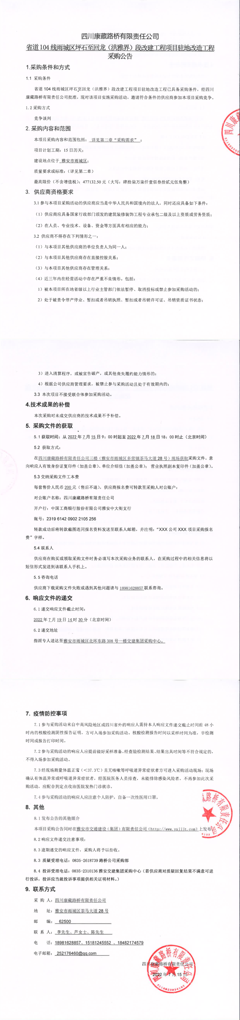四川康藏路橋有限責(zé)任公司省道104線(xiàn)雨城區(qū)坪石至回龍(洪雅界)段改建工程項(xiàng)目駐地改造工程采購(gòu)公告