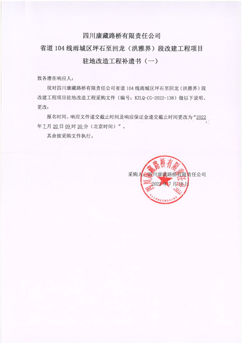 四川康藏路橋有限責(zé)任公司省道104線雨城區(qū)坪石至回龍(洪雅界)段改建工程項(xiàng)目駐地改造工程補(bǔ)遺書(一)