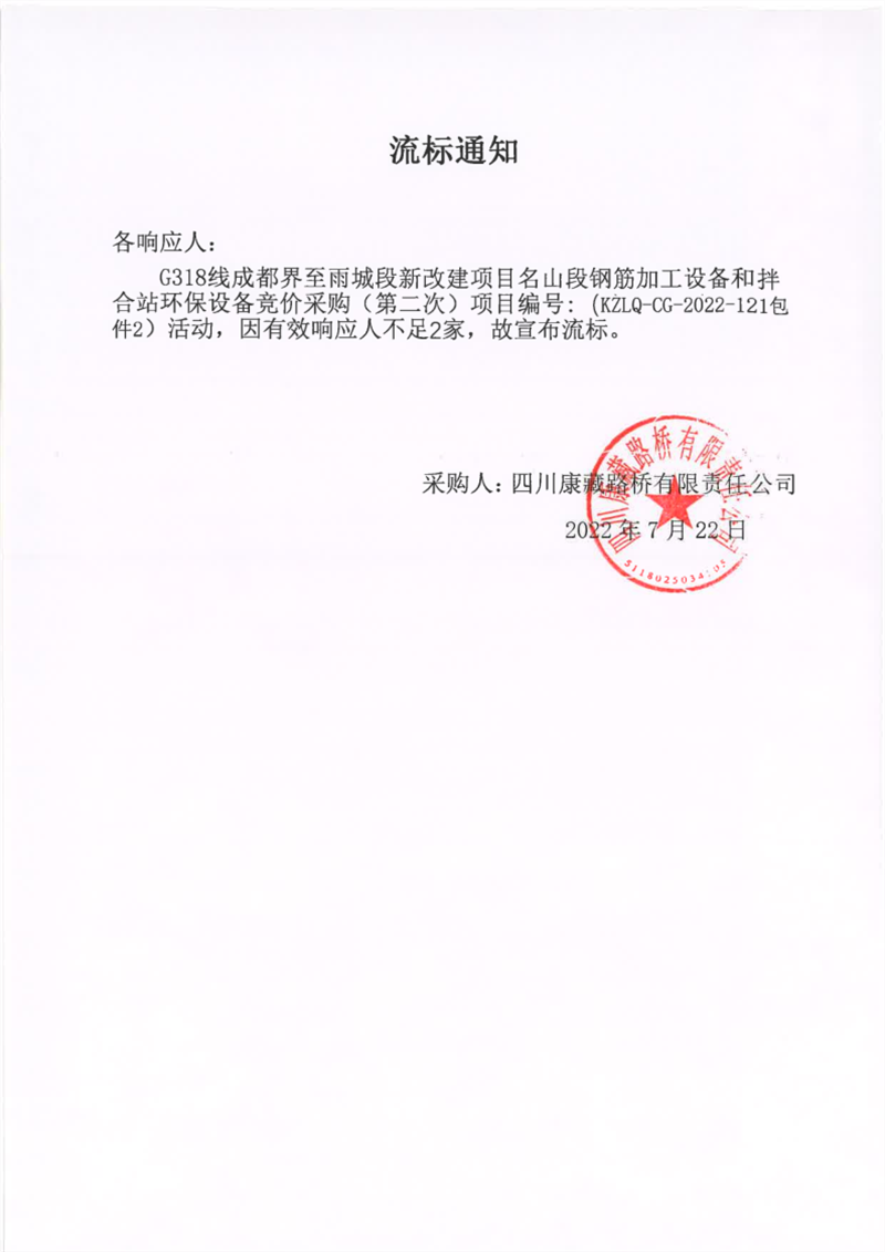 四川康藏路橋有限責(zé)任公司G318線成都界至雨城段新改建項目名山段鋼筋加工設(shè)備和拌合站環(huán)保設(shè)備競價采購(第二次)包件2流標(biāo)通知