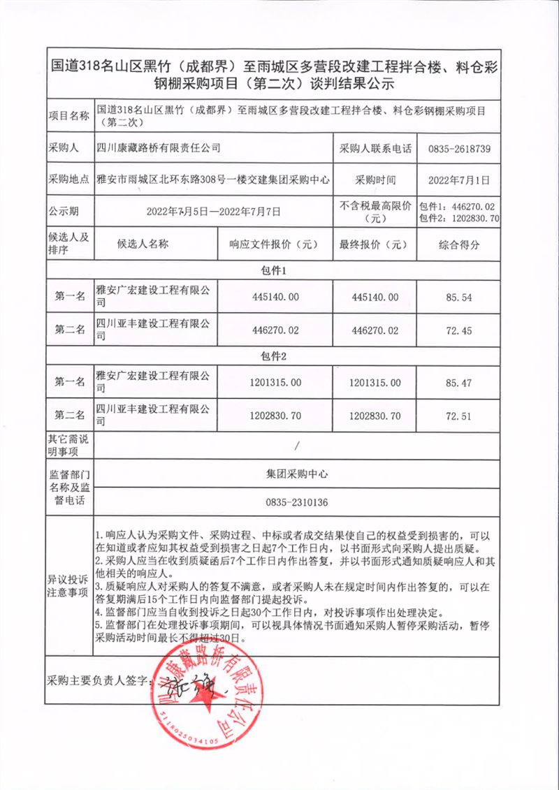 四川康藏路橋有限責(zé)任公司國道318名山區(qū)黑竹(成都界)至雨城區(qū)多營段改建工程拌合樓、料倉彩鋼棚采購項目(第二次)談判結(jié)果公示