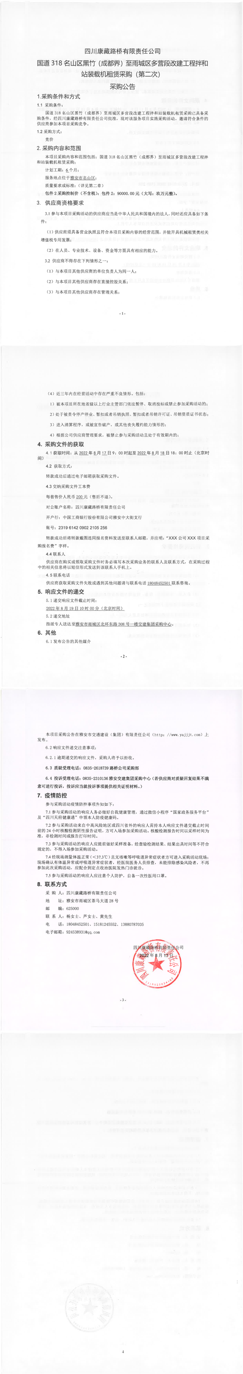 四川康藏路橋有限責任公司國道318名山區(qū)黑竹(成都界)至雨城區(qū)多營段改建工程拌和站裝載機租賃采購(第二次)采購公告