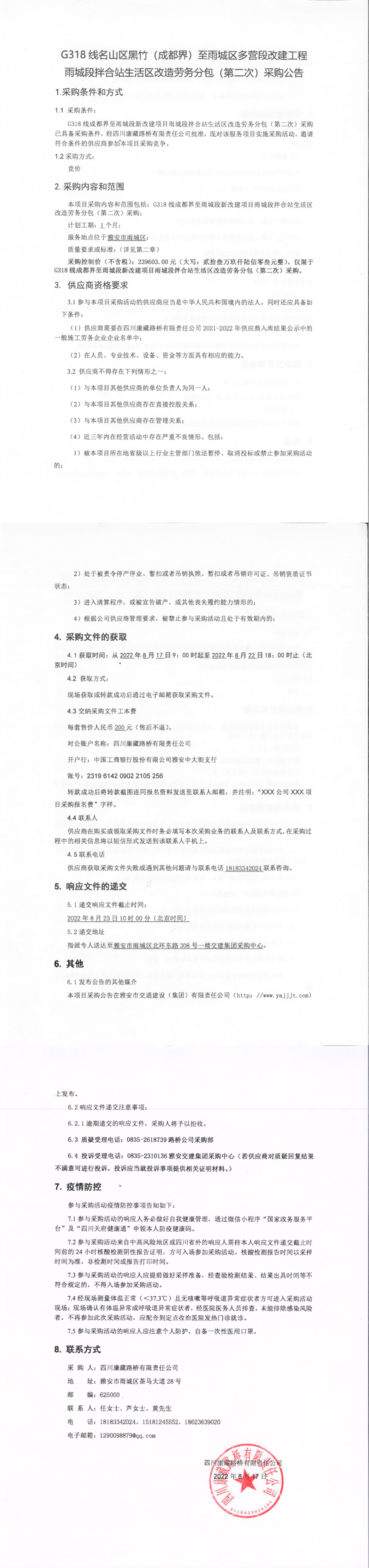 四川康藏路橋有限責任公司G318線名山區(qū)黑竹(成都界)至雨城區(qū)多營段改建工程雨城段拌合站生活區(qū)改造勞務分包(第二次)采購公告