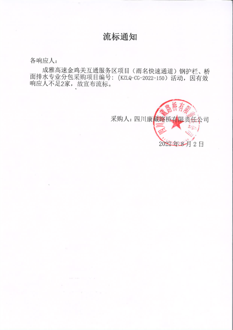 四川康藏路橋有限責(zé)任公司成雅高速金雞關(guān)互通服務(wù)區(qū)項(xiàng)目(雨名快速通道)鋼護(hù)欄、橋面排水專業(yè)分包采購(gòu)項(xiàng)目流標(biāo)通知