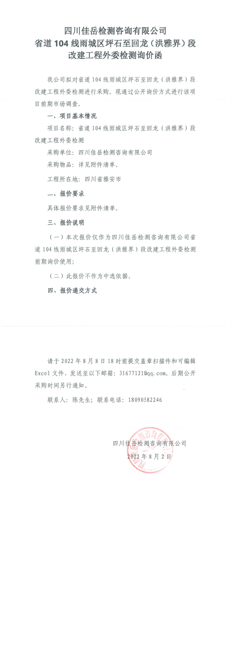 四川佳岳檢測咨詢有限公司省道104線雨城區(qū)坪石至回龍(洪雅界)段改建工程外委檢測詢價函