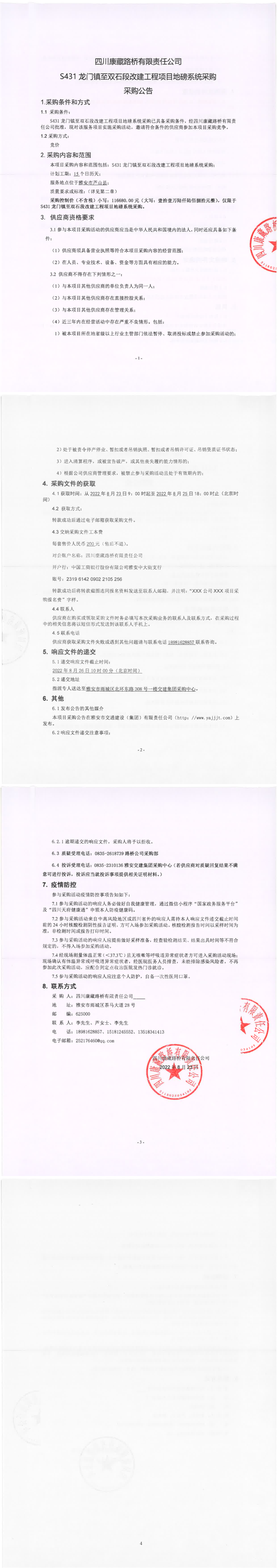 四川康藏路橋有限責(zé)任公司S431龍門鎮(zhèn)至雙石段改建工程項目地磅系統(tǒng)采購采購公告