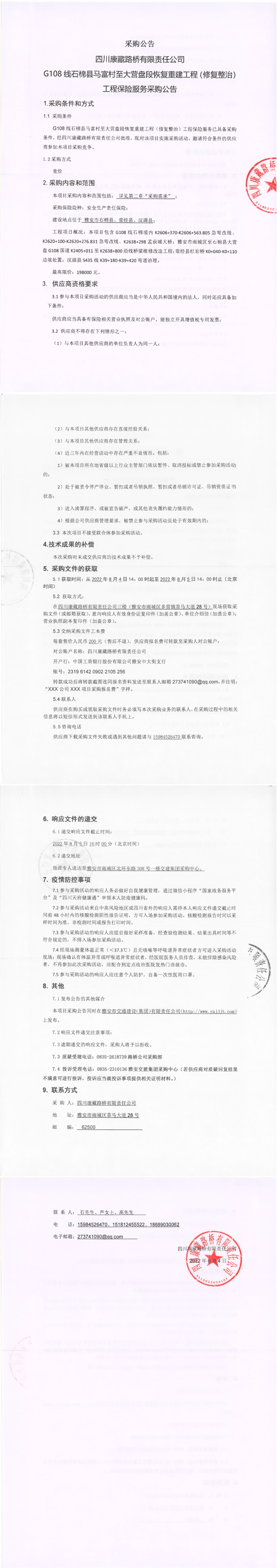 四川康藏路橋有限責(zé)任公司G108線石棉縣馬富村至大營盤段恢復(fù)重建工程(修復(fù)整治)工程保險(xiǎn)服務(wù)采購公告