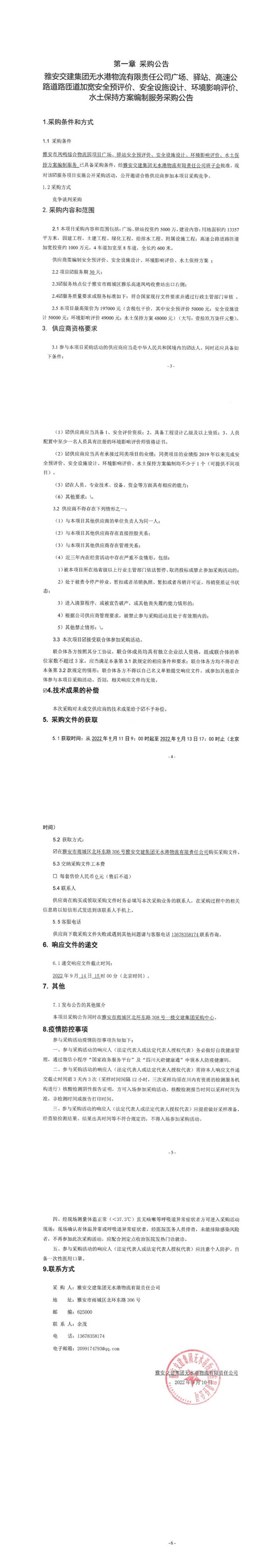 雅安交建集團無水港物流有限責任公司廣場、驛站、高速公路道路匝道加寬安全預評價、安全設施設計、環(huán)境影響評價、水土保持方案編制服務采購公告
