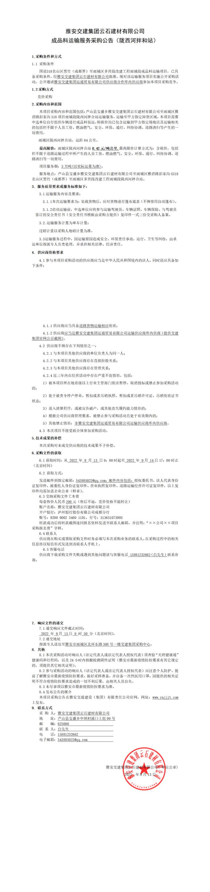 雅安交建集團云石建材有限公司成品料運輸服務(wù)采購公告(隴西河拌和站)