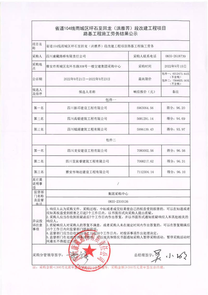 四川康藏路橋有限責任公司省道104線雨城區(qū)坪石至回龍(洪雅界)段改建工程項目路基工程施工勞務(wù)結(jié)果公示