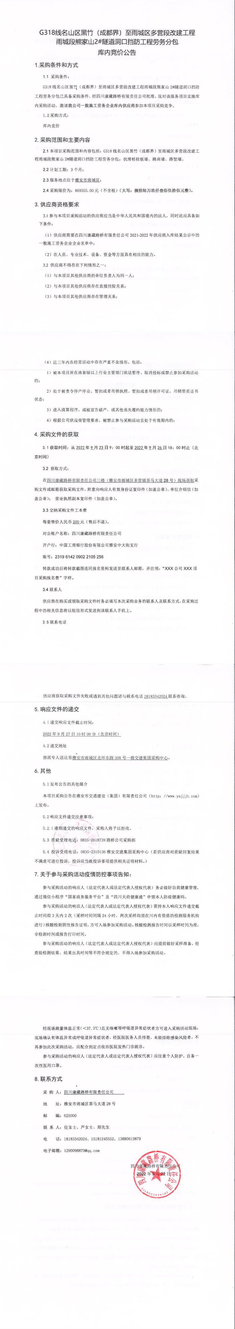 四川康藏路橋有限責(zé)任公司G318線名山區(qū)黑竹(成都界)至雨城區(qū)多營(yíng)段改建工程雨城段熊家山2#隧道洞口擋防工程勞務(wù)分包庫(kù)內(nèi)競(jìng)價(jià)公告