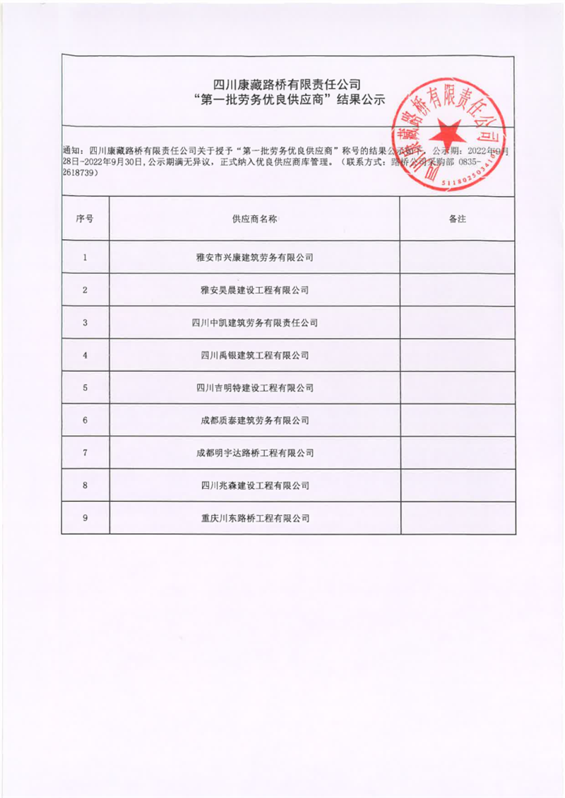 四川康藏路橋有限責(zé)任公司“第一批勞務(wù)優(yōu)良供應(yīng)商”結(jié)果公示