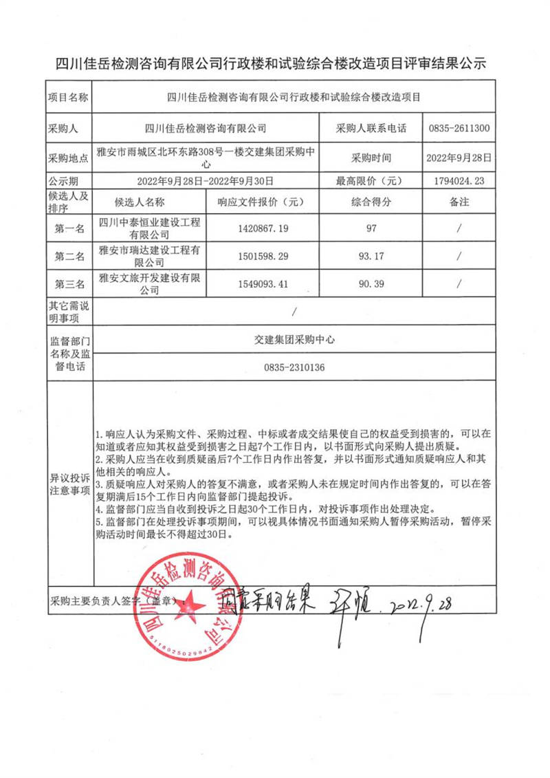 四川佳岳檢測咨詢有限公司行政樓和試驗綜合樓改造項目評審結果公示